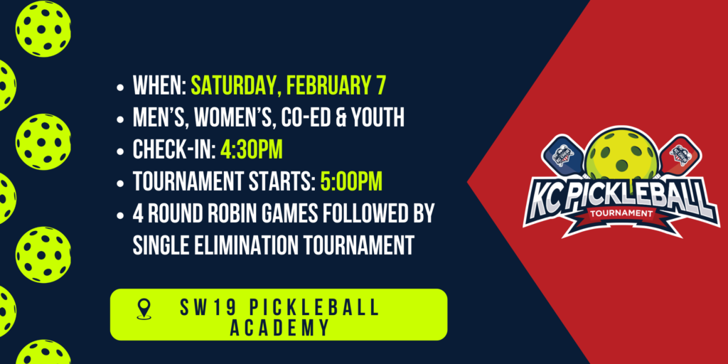 This tournament is currently held at SW19 Pickleball Academy – Leawood. We will be adding additional locations throughout the KC Metro for future events.